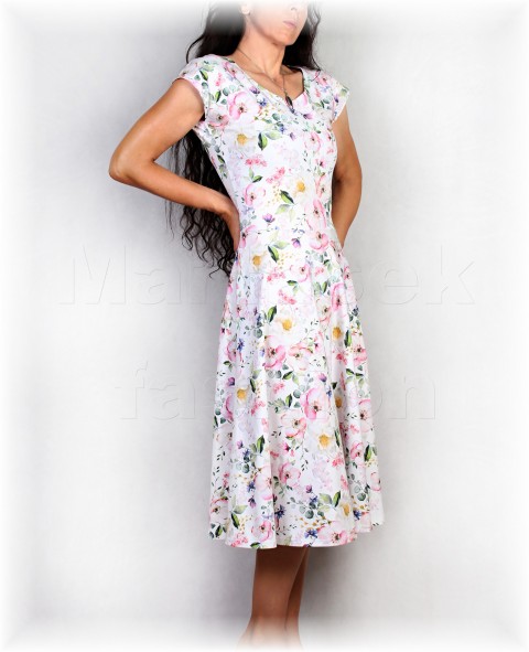 Šaty z bavlněného úpletu,přestřižení v pase a půlkolová sukně, která zakryje i širší boky. Pokud chcete jiný výstřih,připište do objednávky.