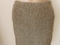 Strojově pletená dámská sukně. Je pletena velmi pružným vzorem, takže se přizpůsobí postavě. Na boku má malý rozparek a v pase pruženku. Velikost S,M: délka 45 cm, obvod pasu v klidu 76cm, dá se natáhnout na 100cm, boky v klidu 84cm. Doporučuji ruční praní a sušit volně položené.