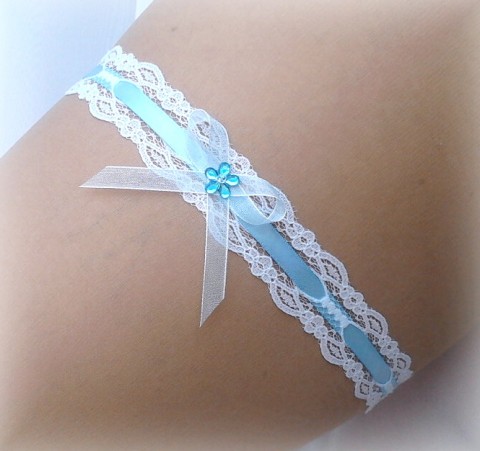Krajkový SVATEBNÍ PODVAZEK - Bílý podvazek pod svatební šaty, zdobeno - modrá kytička, mašlička - šije se na míru - nejlépe uveďte do objednávky konfekční velikost kalhot, nebo obvod nožky zhruba v polovině mezi kyčlí a kolenem. Další svatební doplňky v mé nabídce - vyberete-li více zboží, hradí se jen jedno poštovné a balné. Možnost vyzkoušení, osobního převzetí v Salonu RiScha v Blansku.