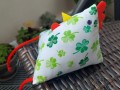 Slepička ušitá ze 100 % bílé bavlněné látky se vzorem lístků jetelíčku v různých odstínech zelené, plněná dutým vláknem, zdobená filcem, plastovými pohyblivými očky a nožkami z oděvní šňůrky. Slepičku lze použít jako jarní a velikonoční dekoraci. Lze ji opatřit i poutkem a zavěsit.