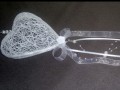 Srdíčko velikosti cca 11x11x5,5 cm motané z bílé bavlněné příze, silně natužené škrobem. Je zdobené šifonovou a saténovou stuhou, perličkami na vlasci, saténovou růžičkami a perličkami. Vše v BÍLÉ barvě.