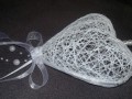 Srdíčko velikosti cca 11x11x5,5 cm motané z bílé bavlněné příze, silně natužené škrobem. Je zdobené šifonovou a saténovou stuhou, perličkami na vlasci, saténovou růžičkami a perličkami. Vše v BÍLÉ barvě.
