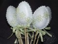Ručně šité vajíčko z bílého filcu/plsti, plněné dutým vláknem, je připevněné na kvalitní bambusové špejli, ozdobené mašličkou ze stužky s malými čtverečky v barvě bílé a zelené a zelenými satenovými kytičkami.