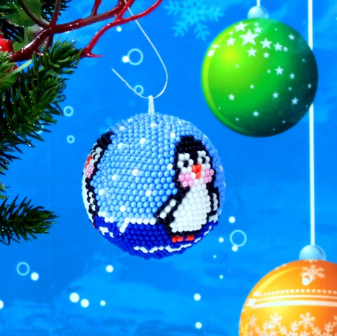 Podklad kouličky je v bílé-modré barvě, ve které jsou vyháčkovány tučňáci