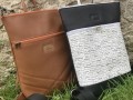 Ušitý z koženky v černé barvě a koženkx s černobílým písmem.