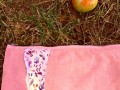 Látková kapsička s rozměry: výška 13,5 cm, šířka 23,5 cm. Taštička je ušitá ze světle růžové sypkoviny dozdobené ručně našitým kouskem lněné košiloviny s jemným květinovým vzorem. Podšívka je z lehké pruhované látky v barevné kombinaci bílá s fialovou/vínovou. Zapínání na kovový zip, šito světle růžovou a bílou nití.