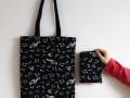Hudební látková kapsička/taštička/pouzdro je ušita z bíločerné látky s hudebními motivy. Podšívka je z šedé látky s bílými hvězdami. Zapínání na zlatý kovový zip. Šířka je asi 12,5 cm, výška 18 cm.