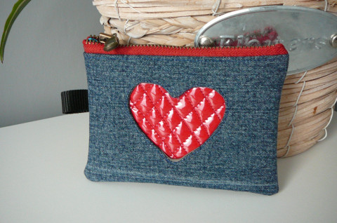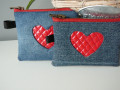 Taštička ušitá z recyklované rifloviny, aplikace srdíčko.