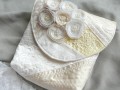 Svatební kabelka s aplikací ručně vyrobených květin, proqiltovaná a hezky drží tvar. Vejde do ní vše co nevěsta potřebuje v nejdůležitejší den života: kapesníčky pro utření slziček štěstí, rtěnka po prvním svatebním polibku, pudr pro zjemnění tvářiček :).