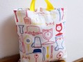 Plátěná taška o rozměrech 37,5 cm, 40,5 cm. Uši jsou ze žlutého popruhu o šíři 20 mm a jsou vysoké cca 7 cm. Ušita je z bavlněného plátna vyšší gramáže.