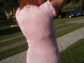 Kombinace pletené a háčkované halenky bez rukávů v růžové barvě.