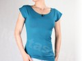 Triko z příjemného viskozového úpletu,lodičkový výstřih,krátký přinechaný rukáv.Nafocená barva je ilustrační-petrolejová.