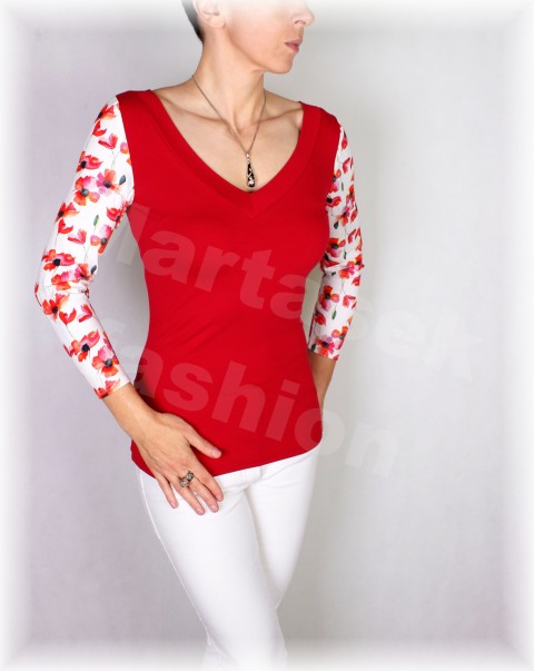 Triko z viskózového úpletu, červený přední a zadní díl,rukávy-barevný vzor. Na přání mohu udělat i kulatý výstřih-připište do objednávky. Triko jde využít celoročně na běžné nošení k riflím, do práce i na slavnostní příležitosti. Můžete kombinovat s jednobarevnou sukní v bílé, smetanové, červené, zelené, černé barvě.