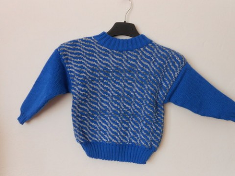 Strojově pletený dětský, žakárový svetr, nemá v rubu nitě. Kombinace středně modré a bílo-šedého melíru.. Velikost 116: délka 37cm, šířka 32cm, délka rukávu od krku 42cm. Doporučuji jemné praní a sušit volně položené. Akryl.