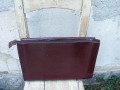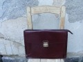 Pevná vínová kůže, zásuvné ucho. Rozměr 27 x 39 cm, měřeno bez ucha. Postranní šíře cca do 9 cm. Pěkný stav, kvalitní práce. Uvnitř bez podšívky. Jedna velká přihrádka na zip, druhá o něco menší v přední části na zámek, klíček chybí.