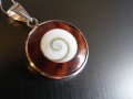 Velmi zajímavý přívěsek - mušle a dřevo, uchyceno ve stříbře. Šperk je z obou stran stejný. Průměr bez ouška cca 2 cm, délka s ouškem cca 3,3 cm.
