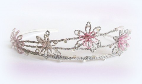 Korunka do vlasů, svatební, nebo na ples a na slavnostní příležitosti. Vyrobena z ručně paličkované krajky, pokovené příze, drátek, skleněné korálky.