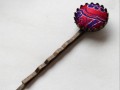 Bronzová sponka do vlasů ozdobená látkovým buttonkem z červenofialového brokátu. Celková délka sponky je cca 6 cm, průměr kulaté ozdoby je 1,6 cm.