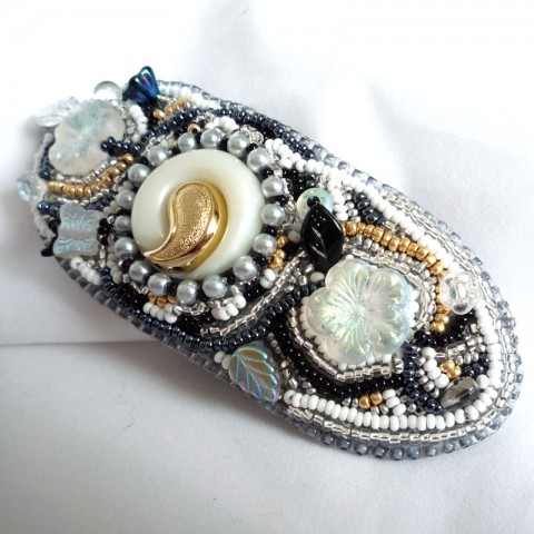 Krásná originální spona do vlasů zhotovena korálkovou výšivkou na plsti.Dominantu tvoří knoflík ,dále použity voskové perličky,rokajly,mačkané korálky.