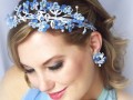 Svatební ozdoba z ručně paličkované krajky. Čelenka je vyrobena z drobných paličkovaných pomněnkových kvítků a bílých lístečků, dozdobena broušenými korálky, perličkami a štrasovými kamínky. Krajka je vystužena drátkem a našita na stříbrné, kovové čelence. Barva, stínovaná modrá a bílá.