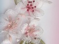 Pás třešňových (jabloňových) květů do účesu z ručně paličkované krajky. Ozdoba je složena ze sedmi bílých, jemně narůžovělých květů s perličkovým středem, doplněno zelenkavými lístky. Do ozdoby je zapracován drátek pro tvarování a udržení tvaru. Šperk se připevňuje do účesu vlásenkami (nejsou součástí ozdoby). Krajka je dlouhá asi 24cm.